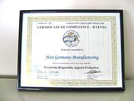 | Hari Garments Manufacturing was issued a Certificate of Compliance-B Level by Worldwide Responsible Apparel Production (WRAP). Click on the image for a larger view. We are certified by Global Security Verification (GSV) for adherence to eight critical supply chain security areas. Click on the image for a larger view. |